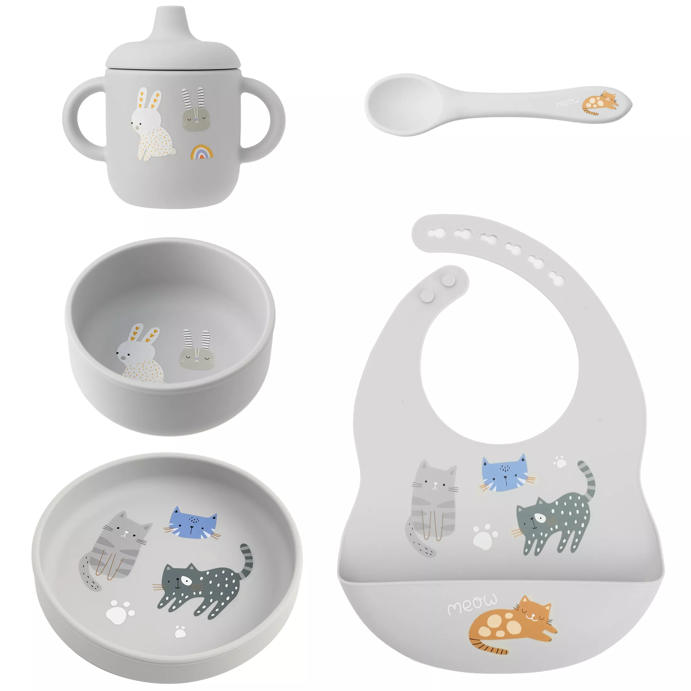 Introduce your little one to a world of independent eating with this adorable and practical 5PCS Silicone Baby Feeding Set. Designed for babies aged 6 months and up, this complete set includes a cartoon-themed suction plate, a matching bowl, soft spoon, waterproof bib, and a learning cup – everything you need to make mealtimes enjoyable and mess-free. Crafted from 100% BPA-free silicone, this baby dinnerware set is safe, gentle, and perfectly suited for tiny hands and sensitive gums.