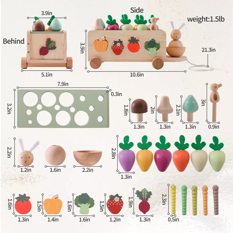 This Montessori Wooden Turnip Car Pull Toy is more than a toy — it’s a playful tool to foster your child’s imagination, coordination, and learning habits. Watch your little one giggle as they “harvest” colorful veggies and roll their new favorite toy around the house. Perfect for birthdays, holidays, or simply everyday fun.