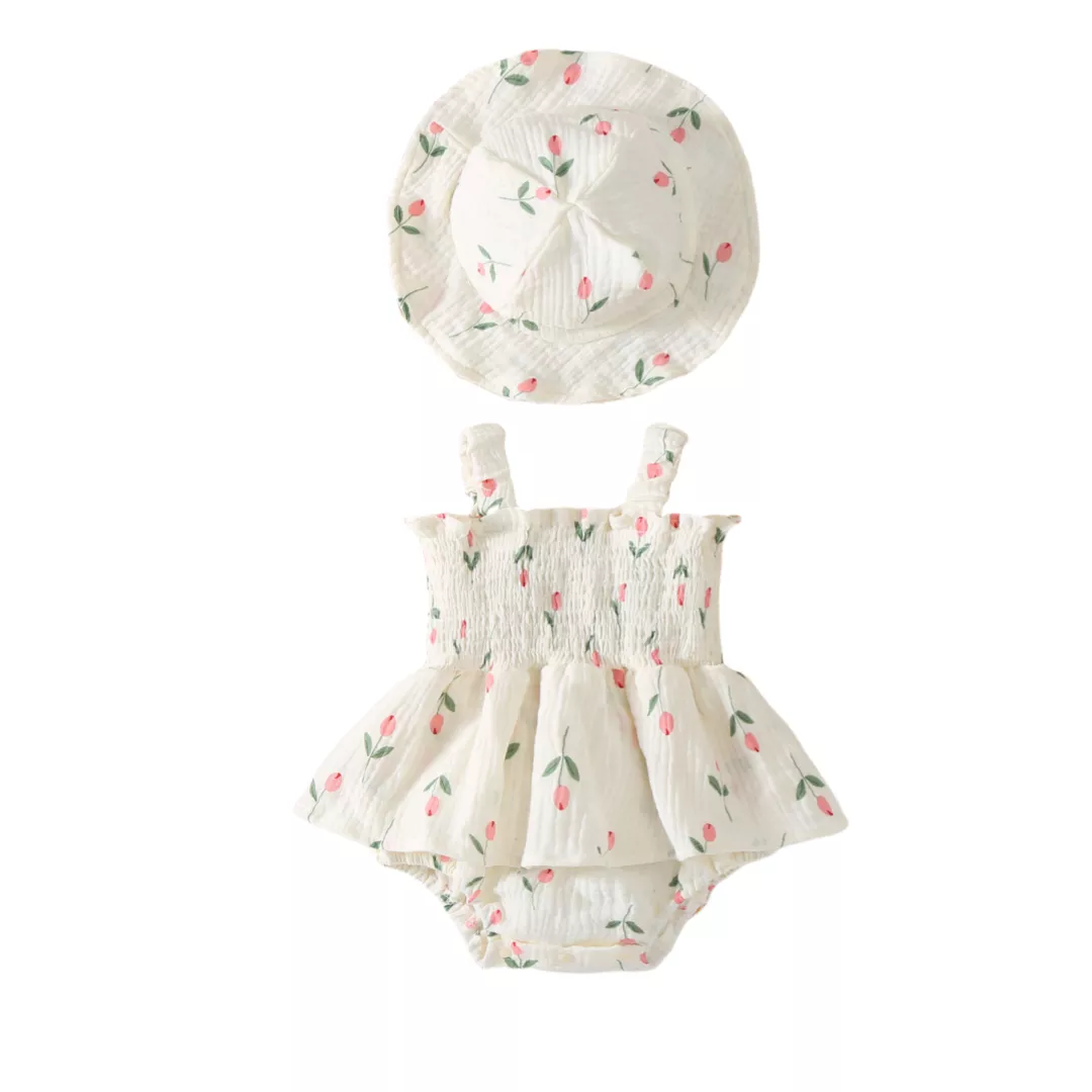 Crafted from a soft, breathable cotton and polyester blend, this bodysuit feels gentle on your baby’s delicate skin. The lightweight fabric and sleeveless camisole design offer maximum airflow, making it ideal for warm weather. The charming tulip floral pattern gives it a fresh, cheerful look that’s picture-perfect for any occasion. The matching hat adds an extra touch of cuteness and helps shield your little one from the sun.